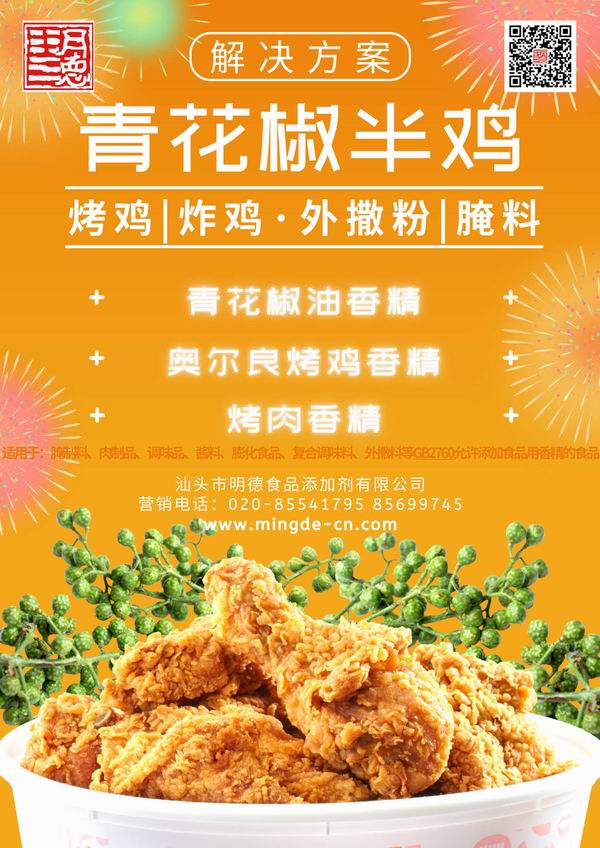 明德食品添加劑 為烤雞、炸雞腌料、外撒粉的廠家朋友們提供了“青花椒半雞”風(fēng)味的解決方案,使廠家朋友們更好更方便的應(yīng)用。