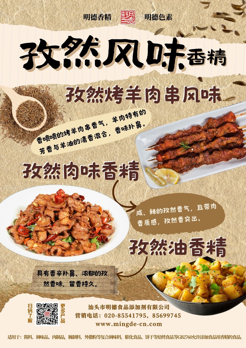 明德孜然風味系列香精 濃郁孜然 烤香誘人汕頭市明德食品添加劑有限公司推出的孜然風味系列香精,涵蓋孜然烤羊肉串風味、孜然肉味香精、孜然油香精等多種調性。產(chǎn)品風味真實,香氣穩(wěn)定,適用于肉制品、調味料、休閑零食、腌制料及復合調味等B端應用,幫助工廠快速打造具有記憶點的孜然風味。